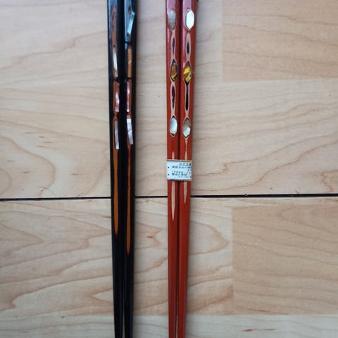 Autentiske lange spisepinner med klassisk asiatisk trykk (drager og tegn).