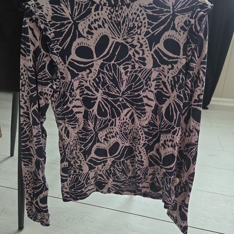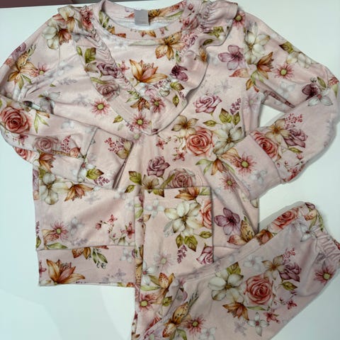 Den rosa buksa er godt brukt, og selv om overdelen ikke er så mye brukt ser det ut som den også er noe flekkete. Er mye mønster da så ikke sikkert ting vises så godt i bruk.