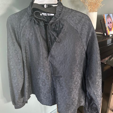 Denne blusen fra Samsøe Samsøe utstråler avslappet eleganse med sitt subtile blomstertrykk i delikate nyanser på svart bakgrunn. Behagelig passform og litt puffermer. Str. S (romslig i størrelsen).