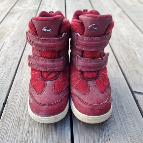 De har blitt litt misfarget, en liten slitasje bak på hælen og har løsnet litt i gummien fremst i tuppen (se bilde).