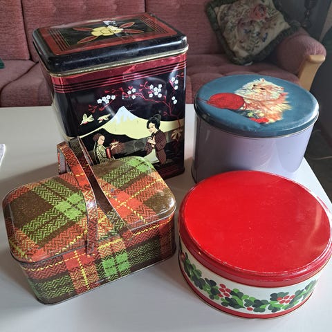 Selger en lot med vintage landhandel varer.