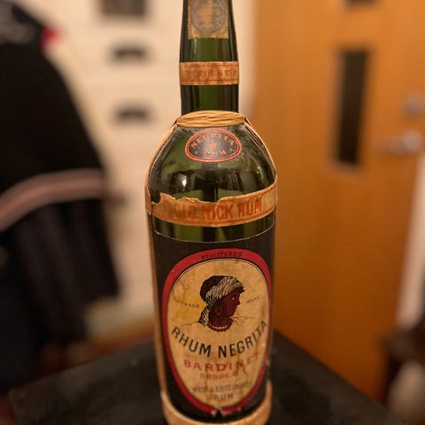 Liten flaske av riktig gammel årgang, ukjent innhold