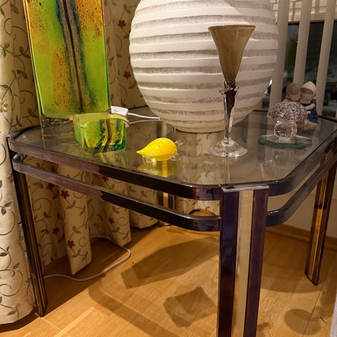 Pent rundt salongbord. Ø80 cm. selges billig. Børstet gull sokkel med sortfarget glassplate. Noen mindre bruksmerker. Må hentes.