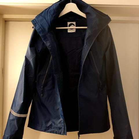 Blå vind-/regnjakke med rosa detaljer og reflekser fra Stormberg selges. Jakken er kun prøvd på, men dessverre er lappen tatt av