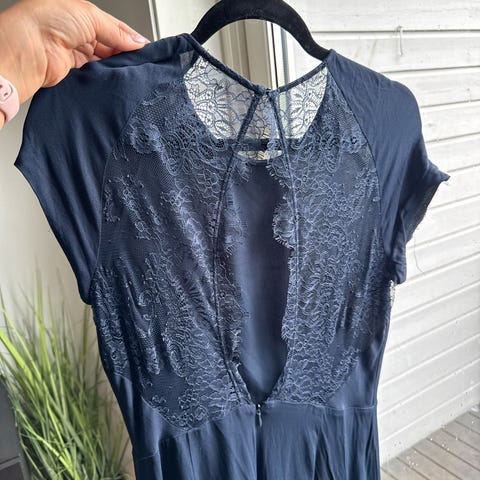 Klassisk marineblå kjole. Lukking med knapp bak. Kjolen har fôr.