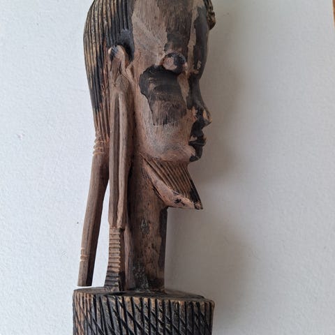 Selger en trefigur av en afrikansk kvinne. Muligens ibenholt. Tung.
