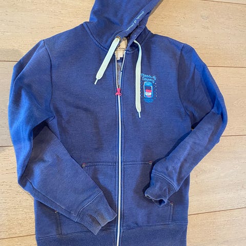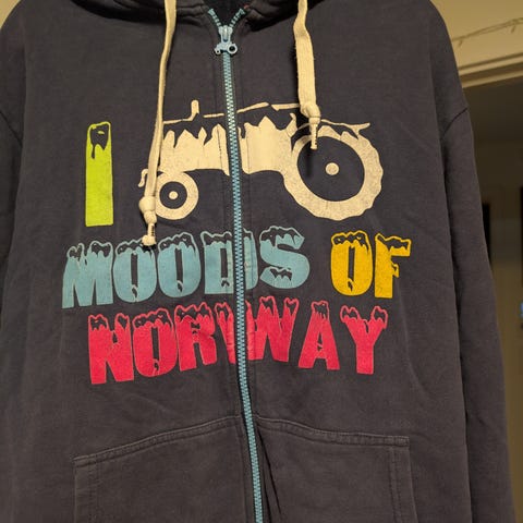 Moods of Norway hettegenser i størrelse M (herre). Genseren er svart med et blått trykk og har en komfortabel passform. Den er laget av mykt materiale som passer godt til hverdagsbruk.
