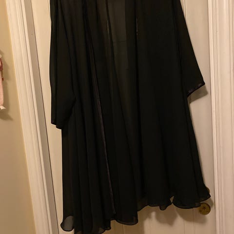 Kort og lett kimono i 100% polyester, merket Britney Spears. Omslagsmodell med belte. Fine blondeavslutninger nederst.