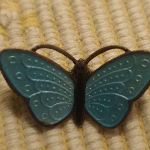 1.Sommerfugl nål i sølv og emalje av Aksel Holmsen. Feilfri både emalje og nål. Med stempel 925S. Ca 2,5 cm lang. Kr 450,-