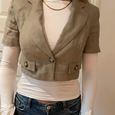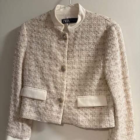 Kortarmet jakke fra Zara. Størrelse M. Farge: hvit. Jakken har en minimalistisk design med korte ermer og dekorative knapper. Passer godt til både formelle og uformelle anledninger.