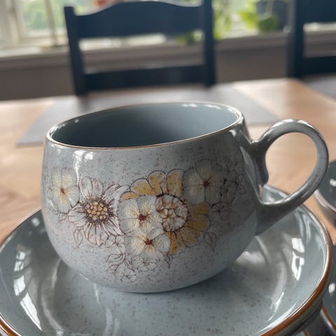 7 kaffekopper med asjett fra ‘Denby’. Arvet fra min farmor, i god stand. Kan hentes på Majorstuen eller sendes i posten mot at kjøper betaler frakt.