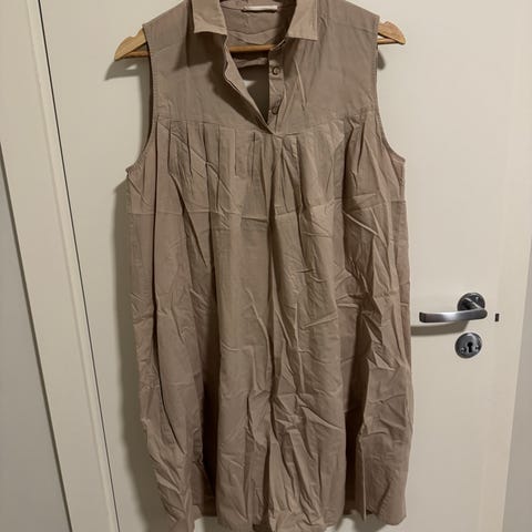 Flott kjole fra MSCH, str M. Kjolen er i lin og viscose blanding. Korte ermer med rynker på skulder. Knapper I front. Lengde ca rett over kne. Knapper I front. Knytebelte I livet. Lett og ledig kjole.