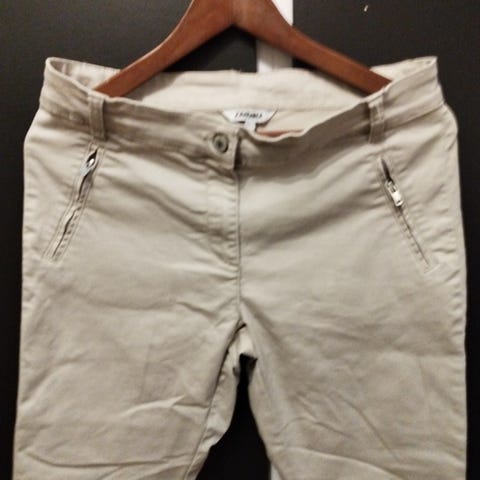 Fin hvit piratbukse i str. 44 fra Zavanna med normal livhøyde, god stretch, smale ben og fine lommer med glidelåspynt. Liten glidelås nederst på bena også. Bare brukt og vasket en gang, siden den ble litt stor til brukeren.