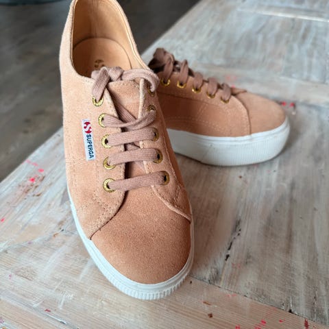 Klassikeren fra Superga i suede. Beige. Størrelse Dette er en lett og behagelig sneaker med en ekstra slitesterk såle, som samtidig gir god komfort på foten. Med en 4 cm høy såle kommer du også litt opp i høyden! Brukt bare inne på kontor.