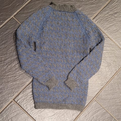 Har strikket en genser i Baby Merino (Woolevo) til min sønn i størrelse 8år som dessverre var for liten da den ble ferdig, noe som var veldig leit og kjedelig for oss begge. Den er i blågrå farger + grønn, og har mønster med traktor, lastebil og gravemaskin. Den er altså helt ny, aldri brukt, så vi håper at en annen gutt (eller jente) vil få glede av denne. :)