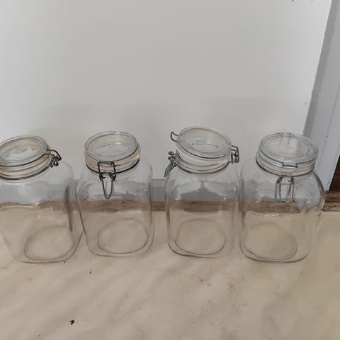 4 stk glass med patentlokk, god stand. Høyde 22 cm, diameter 10 cm.