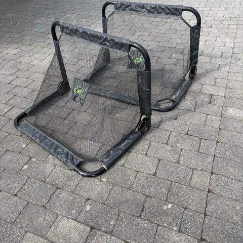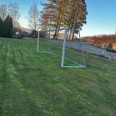 Fotball mål med tre ramme ( trenger noen strøk med ny lakk/maling) - stål ramme bak. Netting- som fungere men heilt klart kan fikses eller skiftes ut.