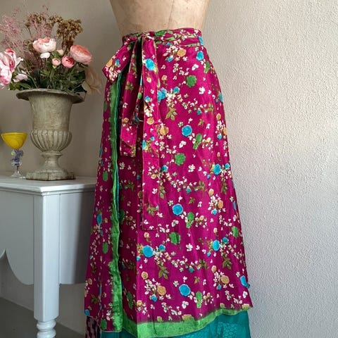 Nydelig langt omslagsskjørt i silkeblanding. Har mange hull så kan justeres i størrelse fra ca xs til xl.💚 #sommer #festival #fargerik #skjørt #omslag #bohem #hippie #indisk #cottagecore #unik #spesiell #silke #vintage #retro