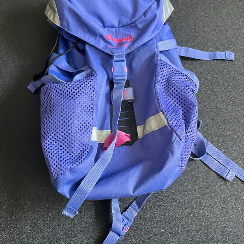 Pent brukt lilla Nordheim sekk med regntrekk i egen lomme under. Brukt på mellomtrinnet og ungdomskolen. God plass til bøker, pc osv. mange lommer. God støtte for ryggen, fin å bruke også på tur.