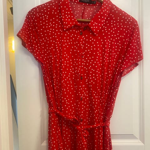 Søt rød prikkete kjole med knapper og lommer. Den går ned til midten av leggen på meg som er 1.60. Den er litt gjennomsiktig så greit med en underkjole under. 😊🌸