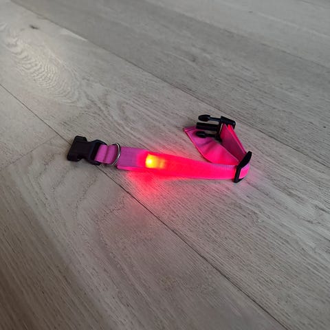 Halsbånd med blått lys (tre ulike innstillinger, CR 2032 batteri) selges. Aldri brukt! Står 51 cm, men jeg måler omkretsen til ca 45cm (maks).