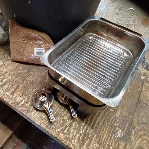 Røyken skapes ved å legge et jevnt lag med røykspon i bunnpanna og med rødsprit i brennerene.