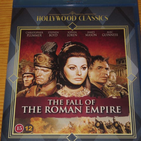 Romerrikets fall (The Fall of the Roman Empire). Film fra 1964 med Christopher Plummer, Stephen Boyd, Alec Guiness og Sophia Loren. Regissert av Anthony Mann. For tilsammen 100 kr
