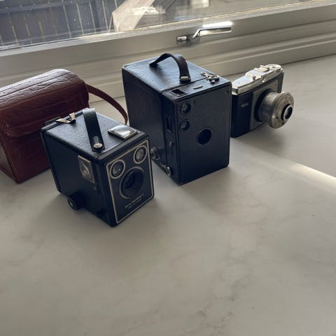 Digitalkameraer, filmkameraer, antikkameraer og objektiver.