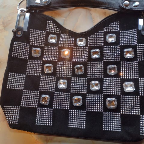 Jeansveske med perler som er brukt én gang på temafest. Kul veske som er like fin til hverdags som til fest.