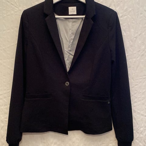Fin mørk grå blazer med ribbe på armene og på lommene. Stoffet er mykt og melert.