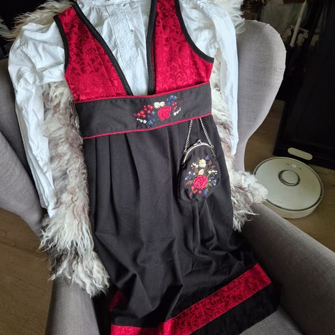 Pent brukt festdrakt str 134 med skjorte (str 128), veske og hårbøyle. Fra Cubus. Les mer her