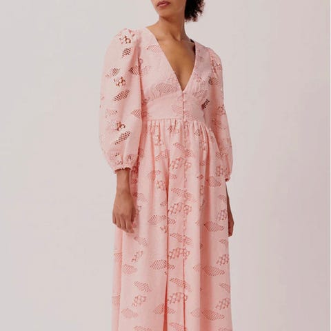 Lillian Dress fra Hofmann Copenhagen. Den nydelige Lillian-kjolen er laget i et mykt og behagelig bomullsstoff med et unikt, egenutviklet broderidesign. Kjolen er like fin i hverdagen som til fest - bare bytt ut sneakers med høye heler og du er klar for fest. Designet med normal passform, dyp V-hals, lange ballongermer med elastiske håndledd, knappelukking foran og knytedetalj i ryggen. Den faste midjen skaper en definert, flatterende silhuett.Modellen er 178 cm høy og har på seg en 36 Materiale: 100% bomullBroderi: 100 % polyester. Aldri brukt. Kun prøvd. Dessverre lapen er borte 🌸🌸