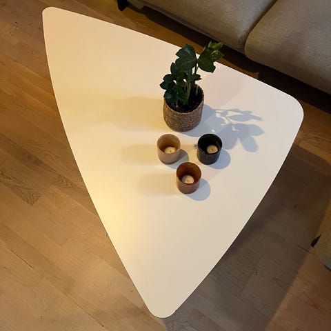 Pent salongbord, modell Liatorp, fra IKEA, i hvitt, med glassplate og rikelig med oppbevaring, en stort skuffet og mer rom under.