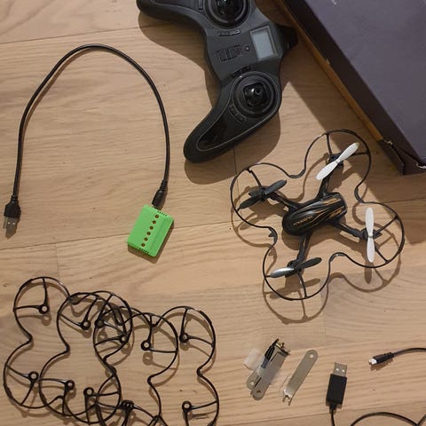 Inkluderer fjernkontroll, batteri til dronen, beskyttelse ramme for propeller, ekstra propeller og bruksanvisning.