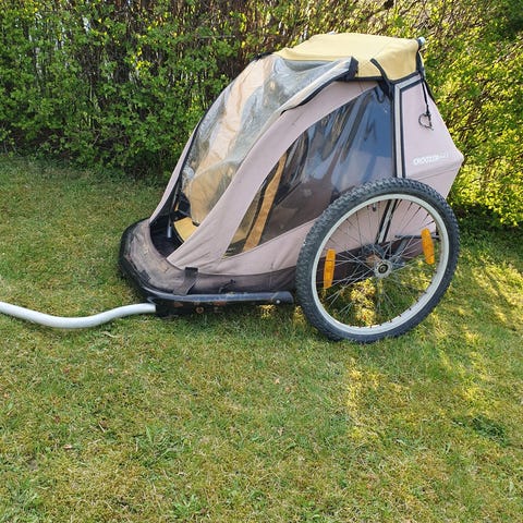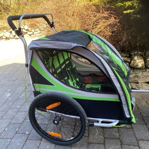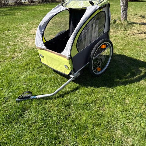 Sykkelvogn eller baggasjevogn. Plass til to barn. Brukt. se bilder. Fungerer fint ellers. Lett og praktisk og trekke med sykkel. Følger adapter til sykkel og flagg som tilbehør.