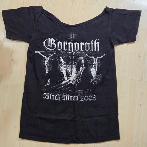 Gorgoroth T-skjorte i svart farge, størrelse L for dame. Laget av bomullsmateriale. T-skjorten har rund hals og et trykk med bandets navn og et skallemotiv på fronten.