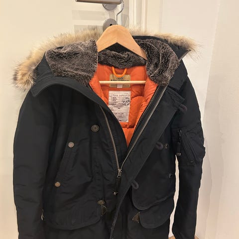 Pen vinterjakke i størrelse 92. Merke Academy, og er i samme stil som Parajumper med oransje detaljer på glidelåser og hemper. Avtagbar pels på hette.