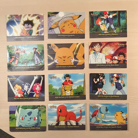 Pokemon kort med episodene til tv serien etter hva jeg skjønner. Veldig varierende tilstand på de ulike kortene.