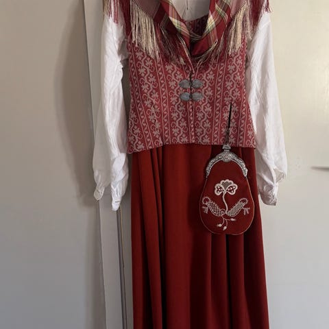 Sølv, veske, bunadsskjorte, forkle og sjal følger med.