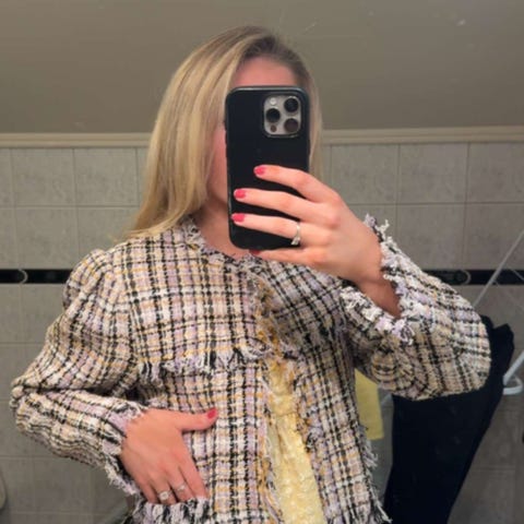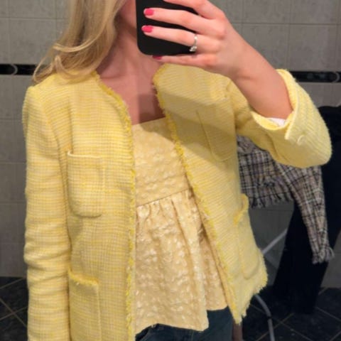 Nydelig vintage Zara jakke selges! Jakken har søte detaljer og kan minne litt om en Chanel jakke. Den har 3 hemper på hver side som kan lukke jakken. Den har også en blomst på siden som fint kan tas av om det også ønskes. Jakken har ermer som stopper rett under albuene. Jakken er i størrelse EUR 40, men bruker selv S og passer perfekt til meg, så vil si den passer en S/M❣️