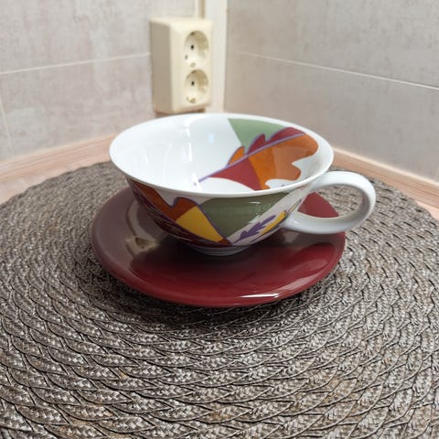Stor tekopp selges for 30 kr. Mønsteret ligner på Figgjo Gourmet, men tror at denne er polsk (se stempel på bilder). H=8,5 cm og ø=9 cm øverst. Hentes hos meg på Langhus, eller sendes sammen med kjøp fra mine andre annonser (minimum 50 kr totalt). Har Vipps. Røyk- og dyrefritt hjem. Søkeord: krus * kaffe * kakao * buljong * Polen * Poland