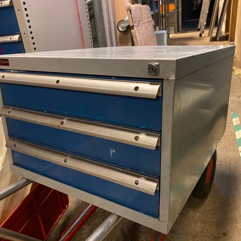Flyttbar stålreol for oppbevaring og hurtig tilgang til verktøy for oppretting, tilbehør for rettebenker eller annet.