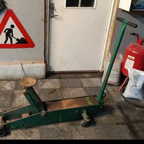 Et monster av en jekk. Fjæren som holder jekkstangen er for svak eller er ødelagt. Skrumekanismen som åpner/stenger virker heller ikke, men kan gjøres enkelt om man bøyer seg litt. Kun 500 kroner. Må hentes.