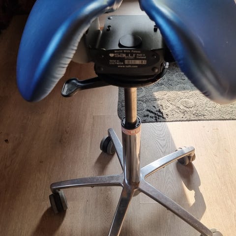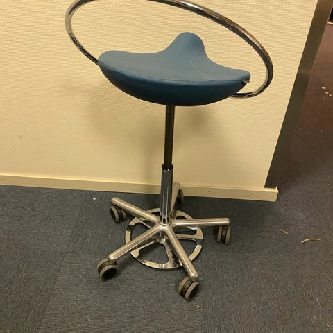 Ergonometrisk sadelstol med skinnsete på hjul.