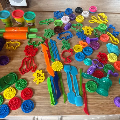 Masse morsomme former, bakeovn med pling, presse, kjevle, sprøyte, trinser samt 5 nye kopper med modellkitt i grønn blå rosa gul og rød. Flott som bursdagsgave eller julegave