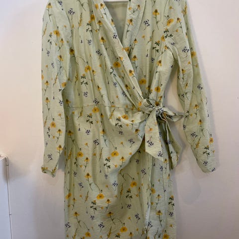Nydelig omslags/sommerkjole fra Gina Tricot i str.xs. Hvitt, lett stoff med gule blomster.