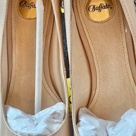 Brudesko brukt veldig lite - kun til photoshoot inne. Skoene er hvite med champagnefarge sløyfer. Liten merke på høyre sko - se bilde nr 7.