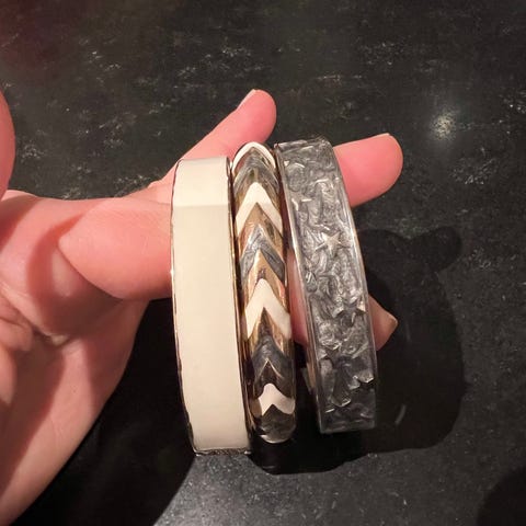 Diameter på ringene er 3,3. cm De bittesmå stenene er lysblå, turkis, orange og mørkerød Det er 5 lengder med en liten gullfarget ring mellom. Den lengste er nesten 5 cm