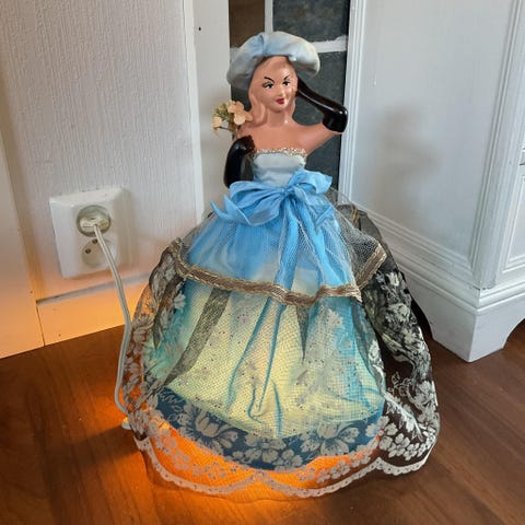 Elegant og romantisk boudoir-lampe fra 50-/60-tallet – en vakker vintage figur med blondeskjørt som lyser opp med varmt og mykt lys. Dette er mer enn bare en lampe – det er et stemningsskapende blikkfang.