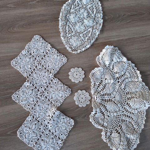 Diverse kniplingsduker selges. Se bilder for detaljer. Noen små misfarginger er par steder, men ellers fine.